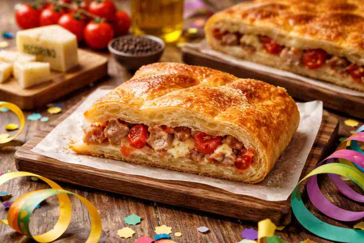 È una focaccia ripiena, alta il giusto, con un guscio morbido e un interno ricco. La facciamo con ingredienti semplici, ma che messi insieme creano un mix di sapori davvero irresistibili. È uno di quei piatti che vorresti mangiare anche se non è Carnevale, e in effetti nessuno te lo vieta!
