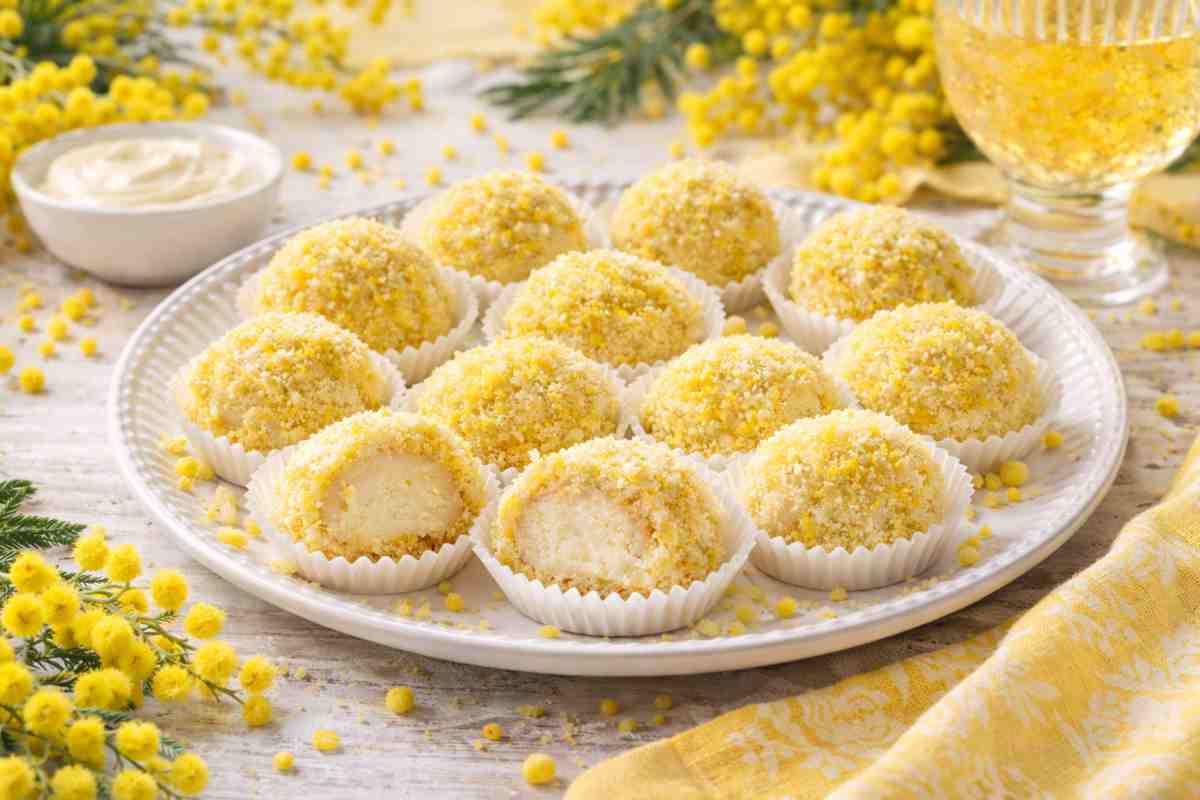 Il nome richiama subito la festa della donna. Quelle briciole dorate di pan di Spagna in superficie ricordano proprio i fiorellini gialli della mimosa. Ed è questo il bello: un dolce semplice che però fa scena. Se ami la classica torta mimosa ma non hai tempo (o voglia) di prepararla intera, questi tartufini sono un’alternativa furba.